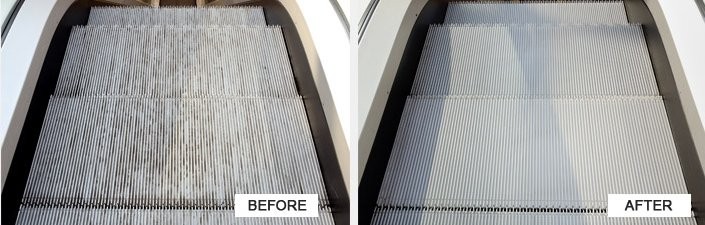 Roller Brushes are fitted to specialised machinery that use rotating brushes to agitate the dirt from inside the grooves of the steps. Block Brushes are a fixed brush that is mounted directly to a fully adjustable T shape steel frame that is then placed at the base of the handrail and uses friction of the fibres to clean built up dirt from the steps.